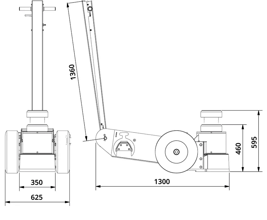 2 uchwyty na drążku podnoszonym do góry i na dół, uchwyty ułatwiają manipulowanie i transportowanie podnośnika