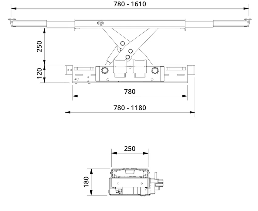 Składana górna belka z opcją przedłużenia do 1610 mm.