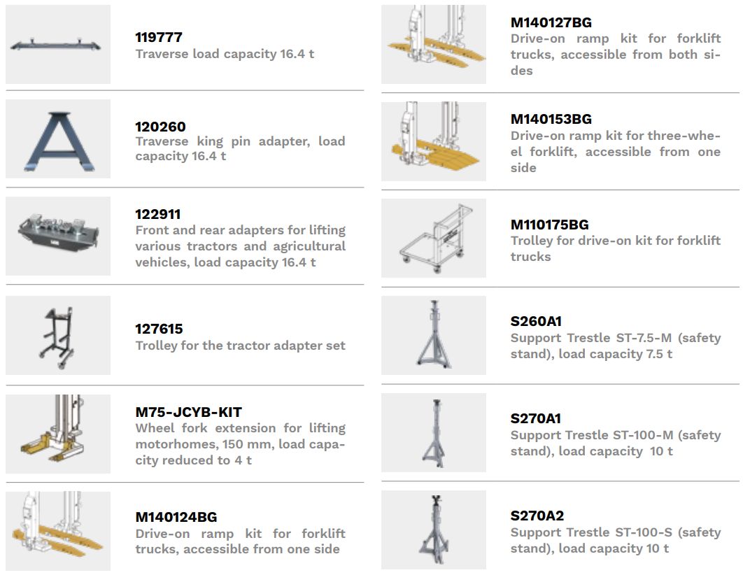 RAV ALPHA MCH 4-7.5 -> zestaw 4 mobilnych kolumn [ RAV.MCH75.197726 ] RAV ALPHA MCH 6-7.5 -> zestaw 6 mobilnych kolumn [ RAV.MCH75.197733 ] RAV ALPHA MCH 8-7.5 -> zestaw 8 mobilnych kolumn [ RAV.MCH75.197740 ] Udźwig jednej kolumny do 7.500 kg. Podnośnik przeznaczony do podejmowania pojazdów o masie od 30.000 kg do 60.000 kg (zależy od wielkości zastosowanego zestawu).