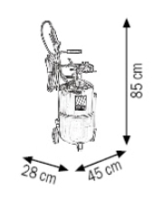 Mobilny pneumatyczny opryskiwacz ze zbiornikiem ze stali nierdzewnej o pojemności 24 L przeznaczony do rozpylania płynów myjących (detergentów), płynów dezynfekujących, olejów o niskiej gęstości, mycia pojazdów i maszyn, grafitowania i smarowania.