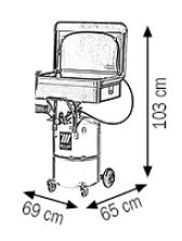 Pneumatyczna myjka do części mechanicznych z wanną o pojemności 50 L umieszczoną na zbiorniku na kołach o pojemności 65 L wyposażona w pędzel myjący z przewodem 1,5 m i pistolet do przedmuchiwania.