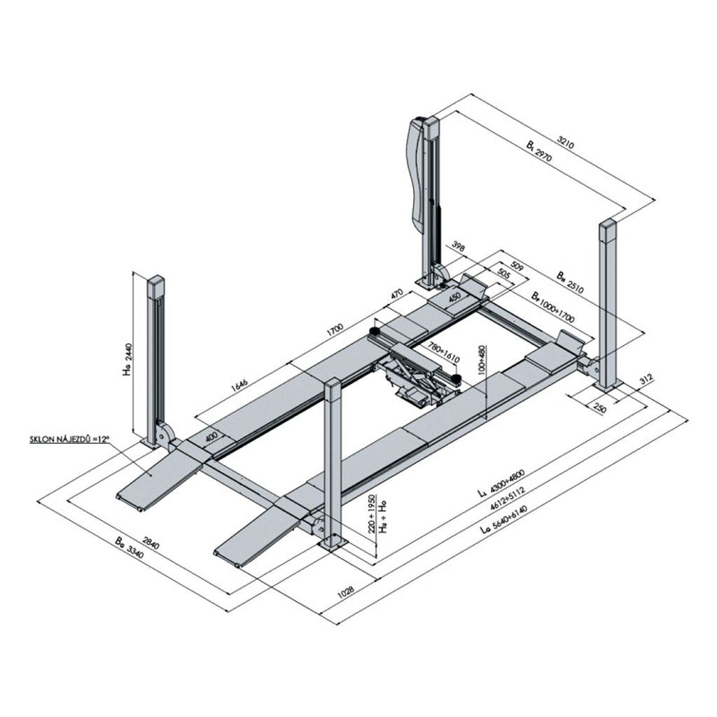 Podnośnik 4-kolumnowy diagnostyczny AMI 4,0 N-WAY przeznaczony do obsługi samochodów osobowych i dostawczych, przygotowany do ustawianie geometrii pojazdów o masie do 4000 kg, idealny do warsztatów o małej przestrzeni.