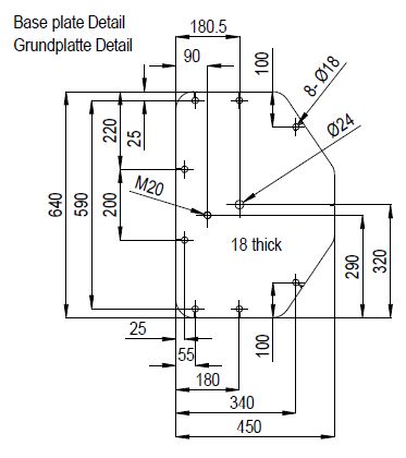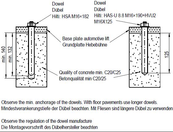 Grubość warstwy nawierzchniowej w przypadku posadzki wykonanej np. z jastrychu, płytek, powłoki z tworzywa sztucznego itp., nie powinna przekraczać 50 mm. Głębokość zagłębienia kotwy w warstwie betonowej fundamentu powinna wynosić  min. 125 mm.