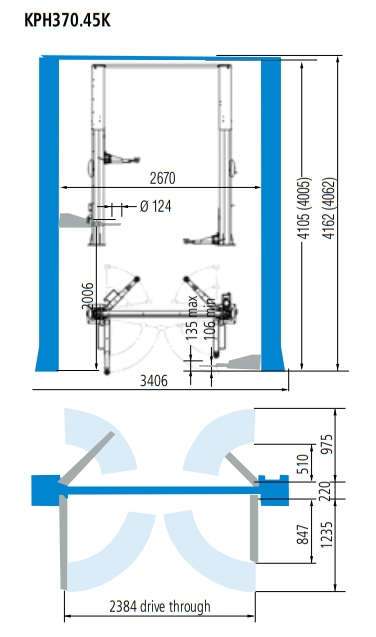 Podnośnik ten posiada elektro-mechaniczne zabezpieczenia z automatycznym włączaniem w pozycji stojącej podnośnika. Podnośnik bezobsługowy o szybkim podnoszeniu i opuszczaniu pojazdu. Każda z kolumn wyposażona jest w bezobsługowy siłownik hydrauliczny. Podnośnik bardzo łatwy i komfortowy w obsłudze. Posiada płynną regulacją opuszczania i podnoszenia oraz regulację wysokości podejmowania pojazdu (95 mm - 135 mm). Podnośnik posiada regulowaną wysokkość całkowitą kolumn (H = 4065mm-4165mm).