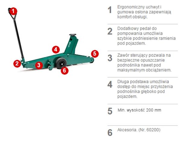 - Dodatkowe pompowane gumowe koła montowane w punkcie równowagi, zwiększające zwrotność podnośnika (nr. 60200)
