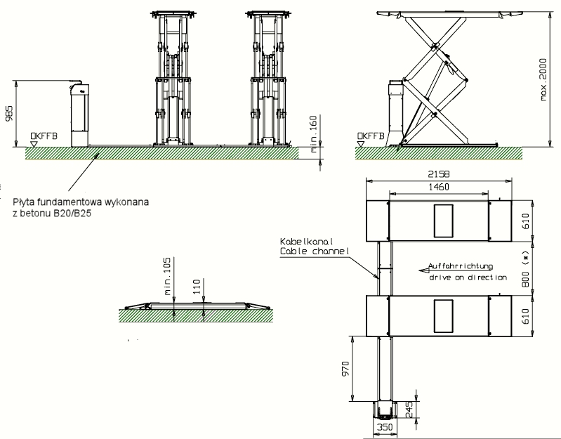 - Podnośnik wysokiego podnoszenia (max. 2000 mm), podprogowy, podwójnie nożycowy, przeznaczony do montażu na posadzce lub jej zagłębieniu (zależy od wersji podnośnika).