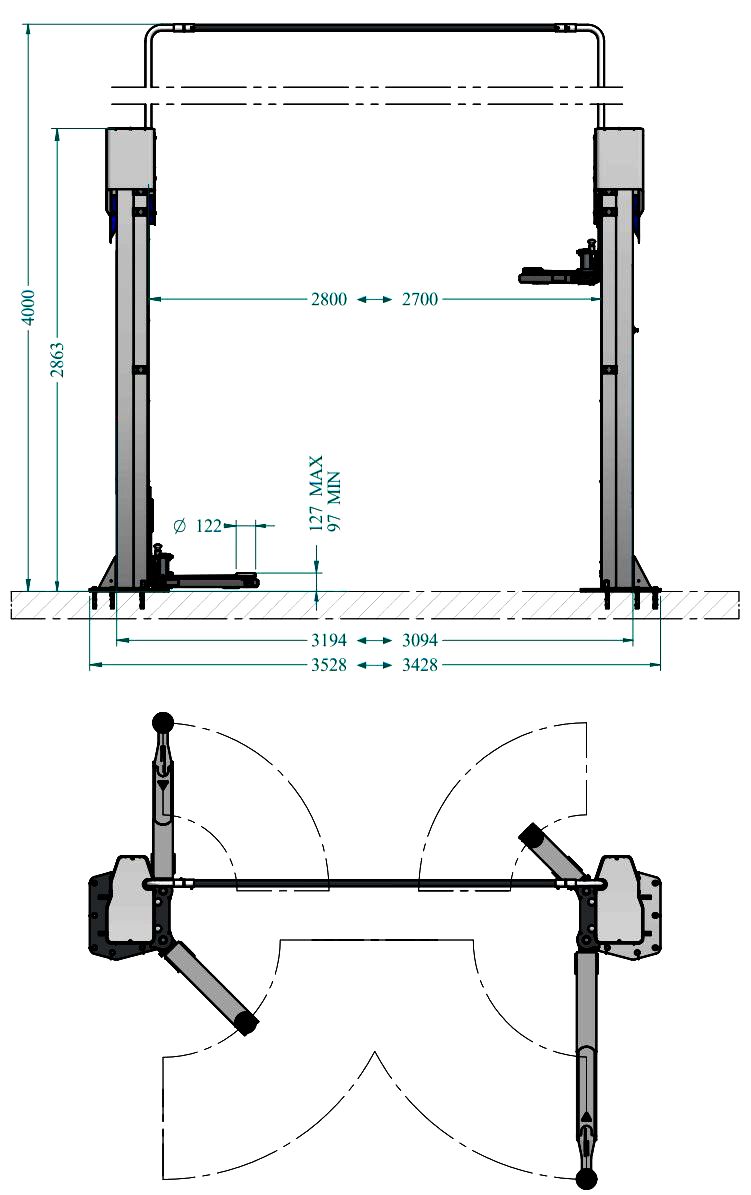 Dwukolumnowy podnośnik śrubowy, elektromechaniczny RAVAGLIOLI KPX42 AV (nowa konstrukcja ramion) przeznaczony do podejmowania pojazdów osobowych, SUV, terenowych i dostawczych o masie do 4000 kg.