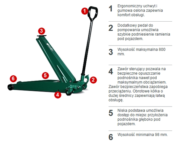 - dodatkowy pedał do pompowania umożliwia szybkie podniesienie ramienia pod pojazdem