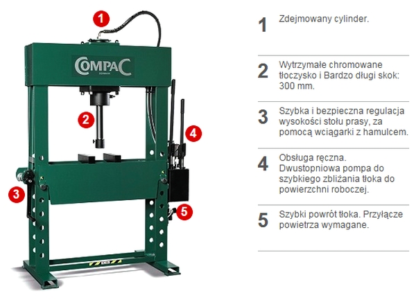 Prasa pneumatyczno-hydrauliczna - COMPAC HP40 o nacisku max. do 40 ton i ręcznym sterowaniu.