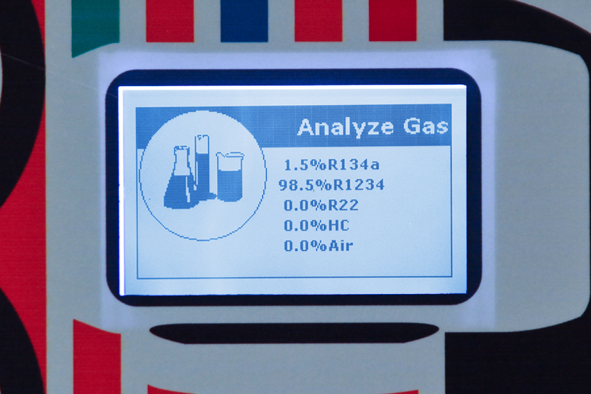 • Wskazania % zawartości 1234yf, r134a, HC (węglowodory), wilgoci, i powietrza w badanym gazie