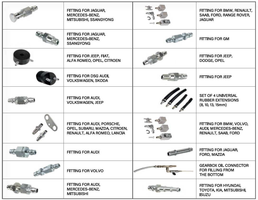 OIL LEVEL CONNECTION Kit (LEVELKIT-ATF): ATF-101 FORD 118- 27 (NPT) ATF-102 Universal BMW, Honda, Nisan, etc ATF-103 VW/Audi ATF-104 VW/Audi, Porsche ATF-105 VW/Audi, Mini cooper M10 x 1.0 ATF-106 VW/Audi DSG M24 x 1.5 ATF-107 VW/Audi CVT M22 x 1.5 ATF-108 Mercedes M12 x 1.5 ATF-109 Skoda M18 x 1.5 ATF-110 Audi/VW, Skoda M30 x1.5 ATF-111 Universal Flexible 300mm ATF-112 Volvo 5/16 - 24 (UNF) ATF-113 Toyota, Lexus M18 x 1.5 ATF-114 Nissan, Infinity M8 x 1.0 ATF-115 ATF-Adapter V.W Passat ATF-116 Nissan Juke M12 x 1.25 ATF-117 Mini Cooper Mitsubishi M14 x 1.5 ATF-118Nissan M10x1.53 ATF-119 GM M12x1.75 ATF-120 Benz 725-9G Transmission