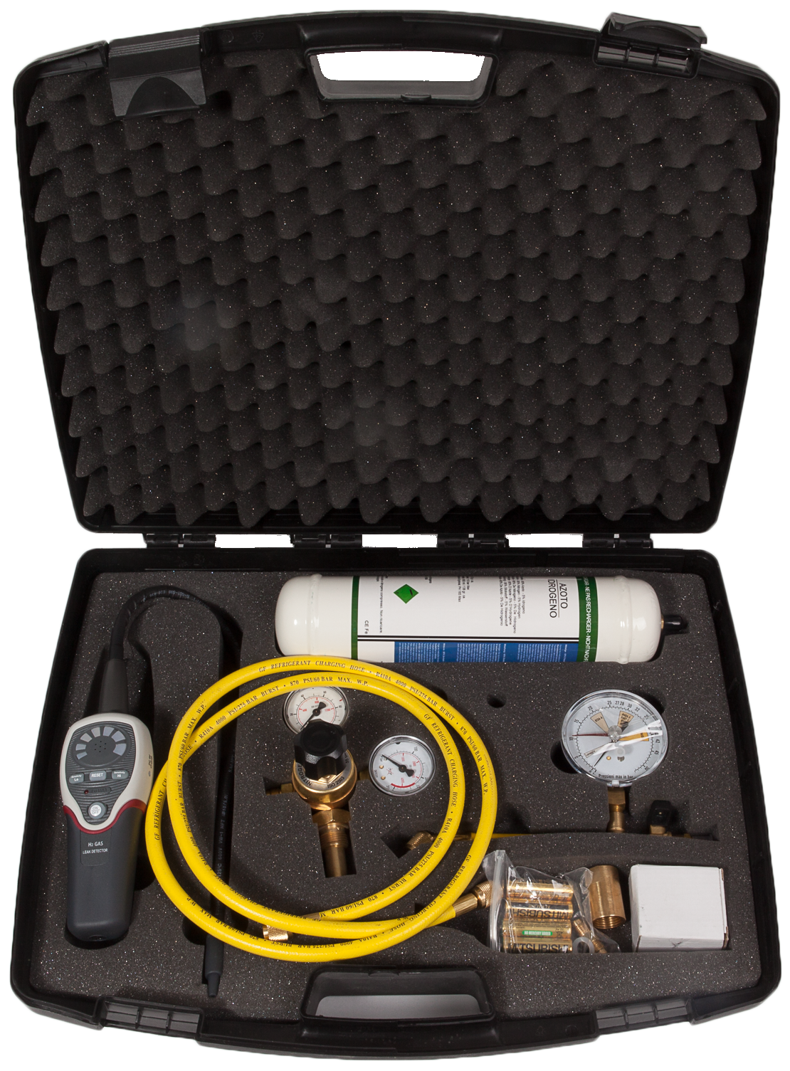 01.000.218 (01.000.225) - Zestaw azotowy - do poszukiwania nieszczelności z wykrywaczem nieszczelności H2, butelka z N2H2 (nie do ponownego ładowania) z reduktorem, złączkami, adapterem "T", adapterami "LP" R134a i R1234yf