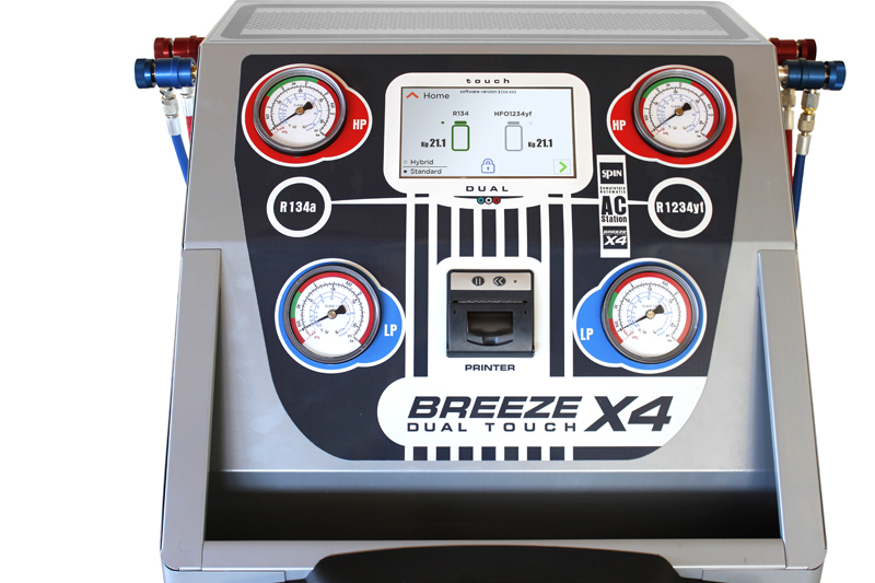 Automatyczne urządzenie SPIN - BREEZE X4 DUAL TOUCH Printer do obsługi układów klimatyzacji z czynnikiem R134a i HFO1234yf w samochodach osobowych, SUV, terenowych, dostawczych, ciężarowych oraz maszyn rolniczych i budowlanych.