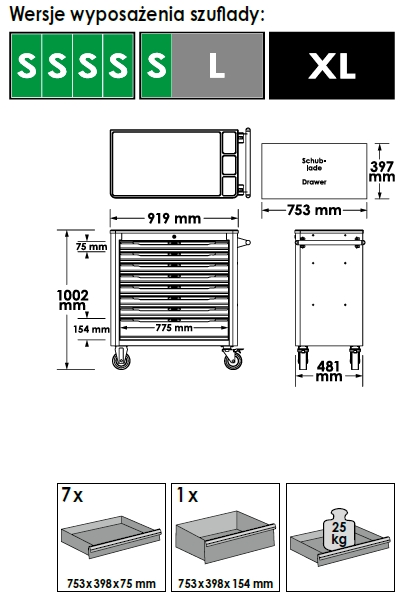 Wózek narzędziowy z 8 szufladami (7 o wys. 75mm, 1 o wys. 154mm)