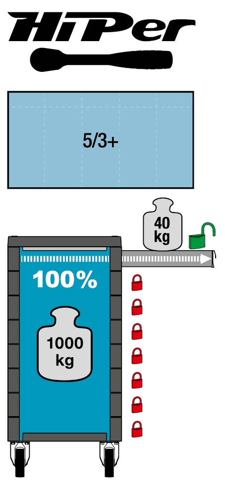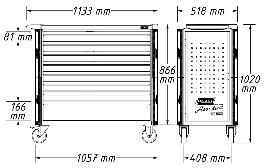 - Wózek narzędziowy z 8 szufladami (7 o wys. 81 mm, 1 o wys. 166 mm)