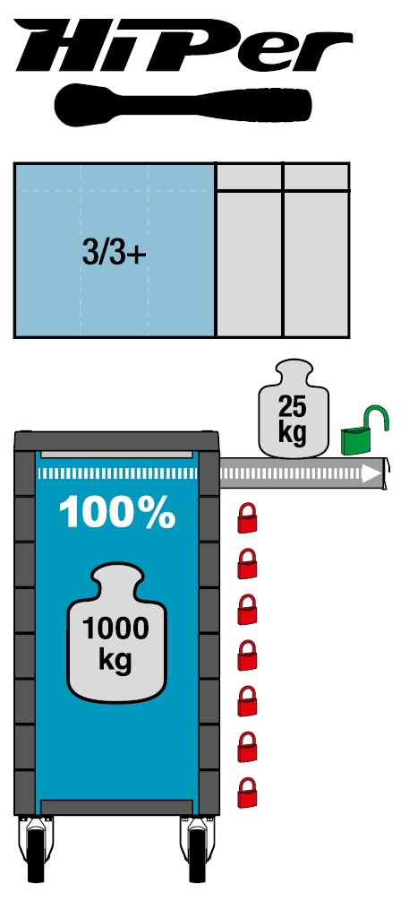 - mechanizm wzajemnego blokowania się szuflad przed wysuwem dla zminimalizowania ryzyka wywrócenia się wózka (w razie potrzeby użytkownik może usunąć kilkoma ruchami rąk)