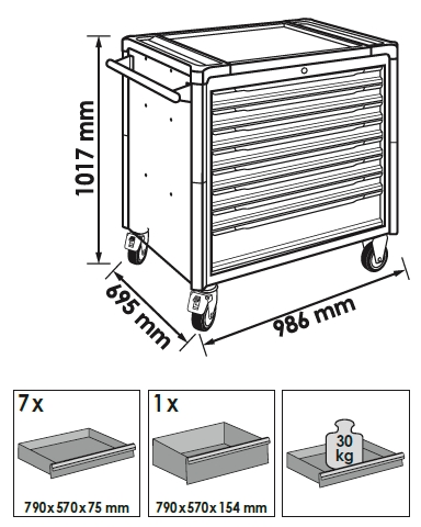 - Wózek narzędziowy z 8 szufladami (7 o wys. 75mm, 1 o wys. 154mm)