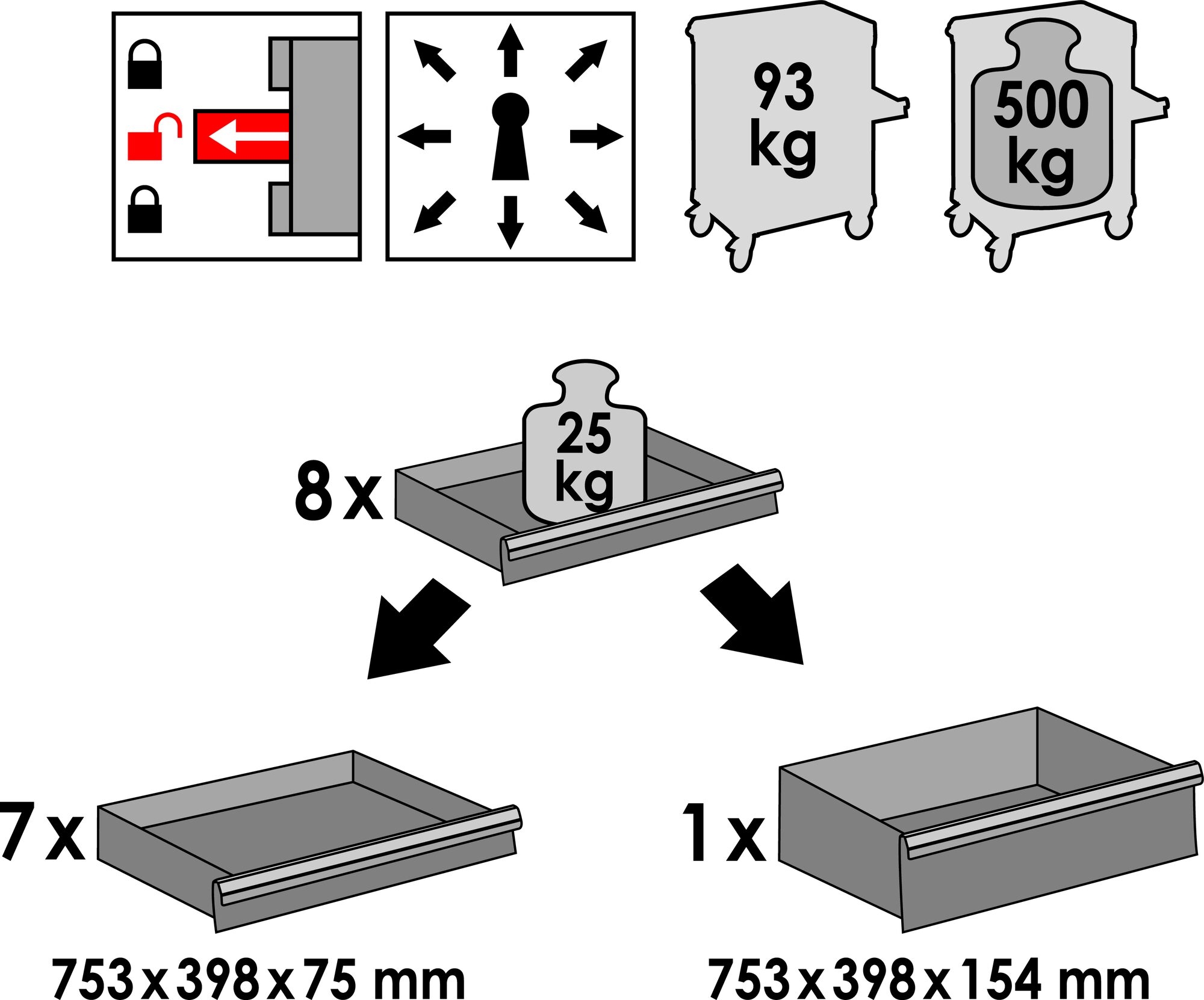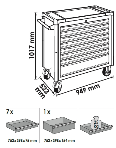 - Wózek narzędziowy z 8 szufladami (7 o wys. 75mm, 1 o wys. 154mm)