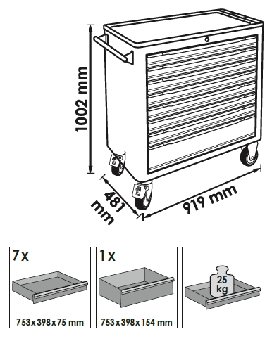 - Wózek narzędziowy z 8 szufladami (7 o wys. 75mm, 1 o wys. 154mm)