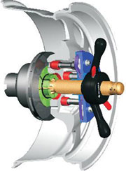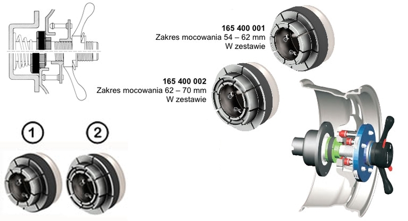• System DuoExpert jest rodzajem tulei centrującej, która rozpiera się cylindrycznie w otworze środkowym felgi i zaciska równocześnie na wałku wyważarki, co powoduje, że wszelkie luzy pomiędzy wałkiem a stożkiem (tuleją centrującą) i stożkiem a felgą przestają istnieć.
