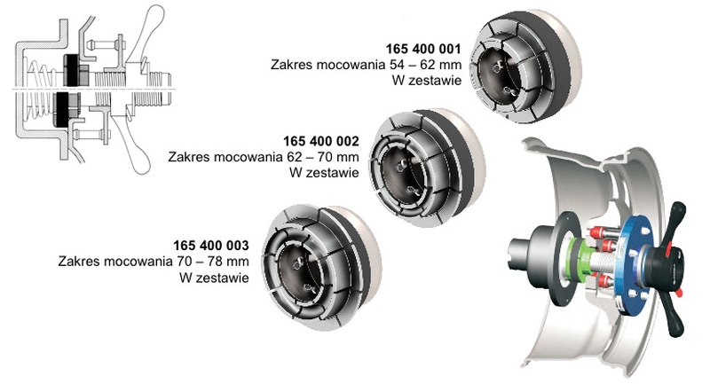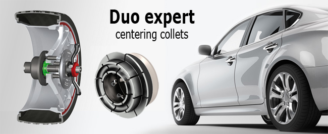 - System DuoExpert jest rodzajem tulei centrującej, która rozpiera się cylindrycznie w otworze środkowym felgi i zaciska równocześnie na wałku wyważarki, co powoduje, że wszelkie luzy pomiędzy wałkiem a stożkiem (tuleją centrującą) i stożkiem a felgą przestają istnieć.